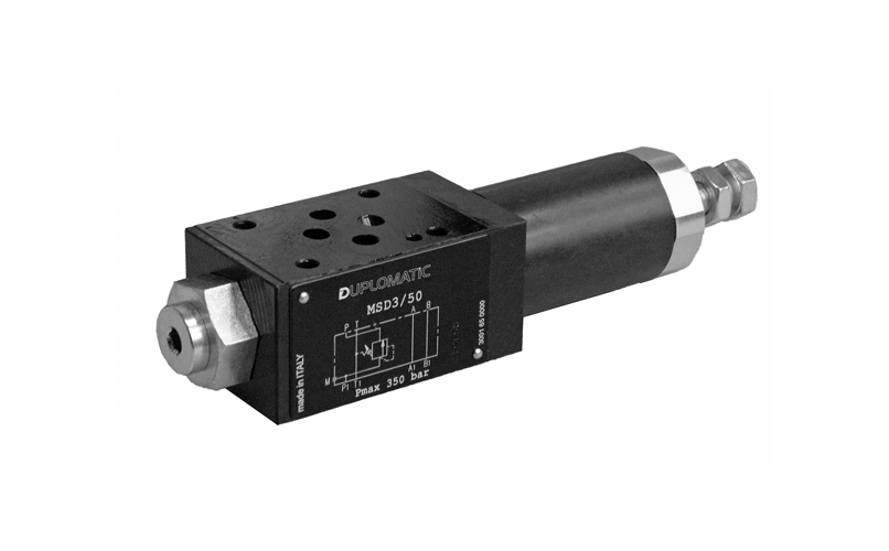 The MSD valve is a direct operated sequence valve with spool, in a stackable version. It is used to control two or more working lines in succession. It is a normally closed valve. It opens when the inlet pressure reaches the set value of the adjustment spring, allowing the fluid to pass through the pressure line. The valve remains open until the pressure in the circuit drops below the value set by adjustment of the spring. It is available in three pressure regulation ranges up to 280 bar. It is supplied with a hexagonal head adjustment screw or SICBLOC knob.