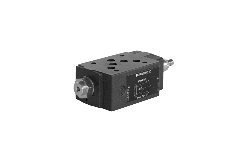 The SD4M valve is a sequence valve with spool, in a stackable version. It is used to control two or more working lines in succession. It is a normally closed valve. It opens when the inlet pressure reaches the set value of the adjustment spring, allowing the fluid to pass through the pressure line. The valve remains open until the pressure in the circuit drops below the value set by adjustment of the spring. It is available with internal or external piloting, in three pressure regulation ranges up to 210 bar. It is supplied with a hexagon socket adjustment screw, locking nut and limitation of the maximum adjustment stroke.