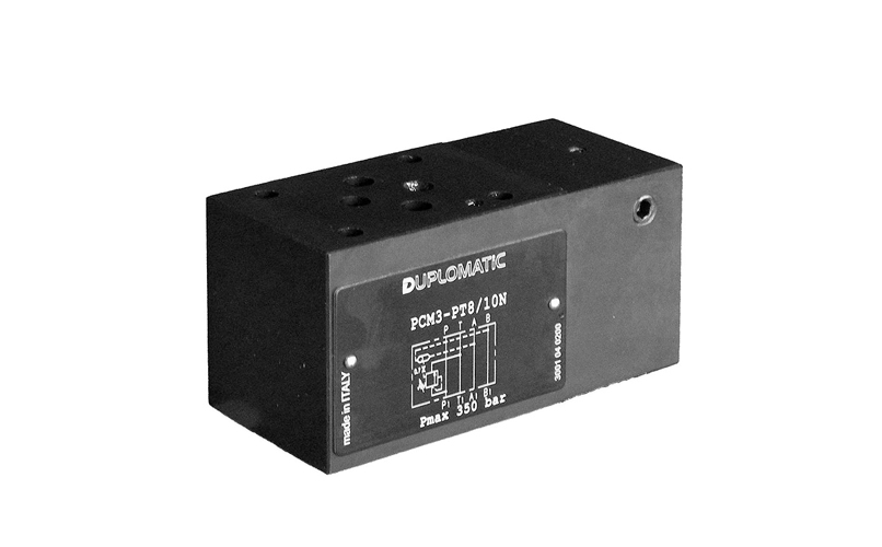 Two or three-way pressure compensator, made in a stackable version. It keeps constant the pressure drop (characteristic ∆p of 4 or 8 bar) between the pressure line and alternatively the A and B lines. It is available in versions with fixed adjustment or variable. It is used together with proportional directional valves in order to create flow control functions that are independent of pressure variations.