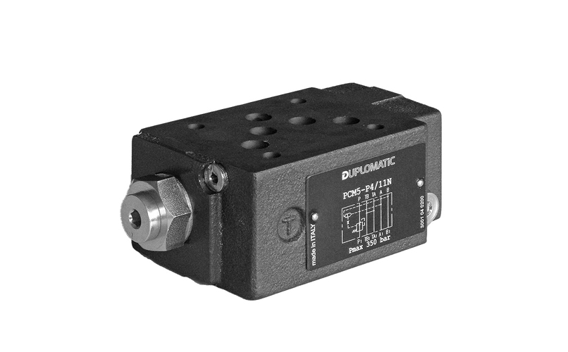 Two or three-way pressure compensator with fixed adjustment, made in a stackable version. It keeps constant the pressure drop (characteristic ∆p of 4 or 8 bar) between the pressure line and alternatively the A and B lines. It is used together with proportional directional valves in order to create flow control functions that are independent of pressure variations.