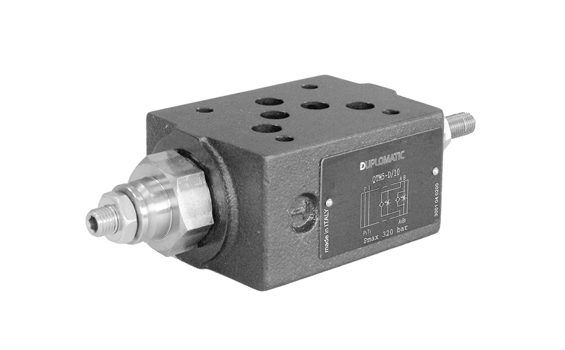 The QTM5 valve is a one-way flow control valve with built-in non-return valve for reverse free flow, in a stackable version. It is available with adjustment on path A, B or on both, for meter-in and for meter-out control. It is supplied with socket hex adjustment screw and locking nut.