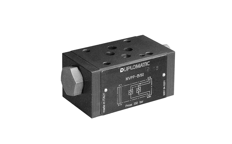 The MVPP valve is a pilot-operated non-return valve with spring closing with cone on edge seals, in which pilot pressure allows free flow in both directions. Stackable design.